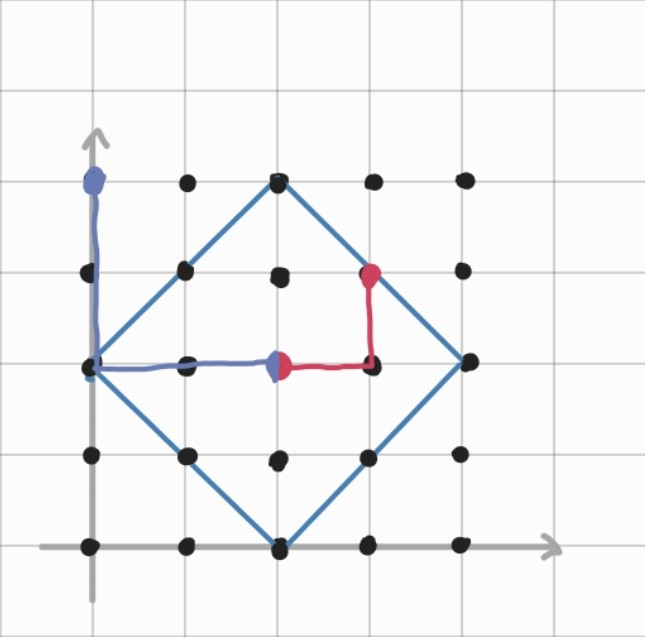 이 때 한칸을 좌표축 위의 한 점으로 볼 수 있는데, 이렇게 되면 중심으로부터 떨어져 있는 거리를 계산해서 마름모 안에 포함되는지, 안되는지를 확인할 수 있다.