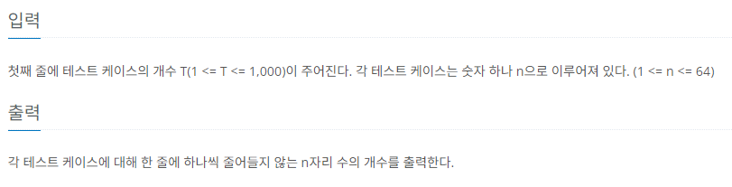첫째 줄에 테스트 케이스의 개수 T(1 <= T <= 1,000)이 주어진다. 각 테스트 케이스는 숫자 하나 n으로 이루어져 있다. (1 <= n <= 64)