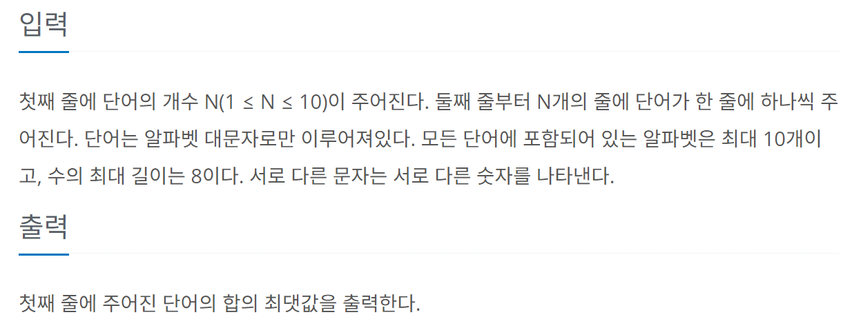 첫째 줄에 단어의 개수 N(1 ≤ N ≤ 10)이 주어진다. 둘째 줄부터 N개의 줄에 단어가 한 줄에 하나씩 주어진다. 단어는 알파벳 대문자로만 이루어져있다. 모든 단어에 포함되어 있는 알파벳은 최대