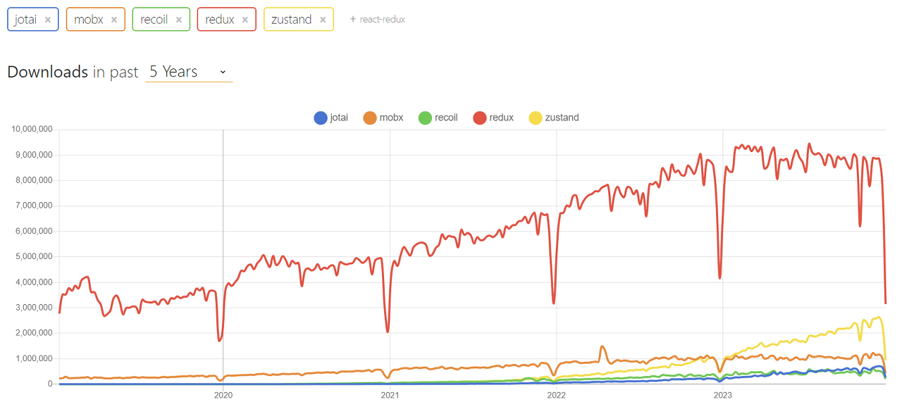 다른 라이브러리들과 큰 차이를 보이는 Redux와 그 아래로 2023년 급격한 상승을 보이는 Zustand가 눈에 띈다. 그 아래는 비슷해 보이는 느낌..