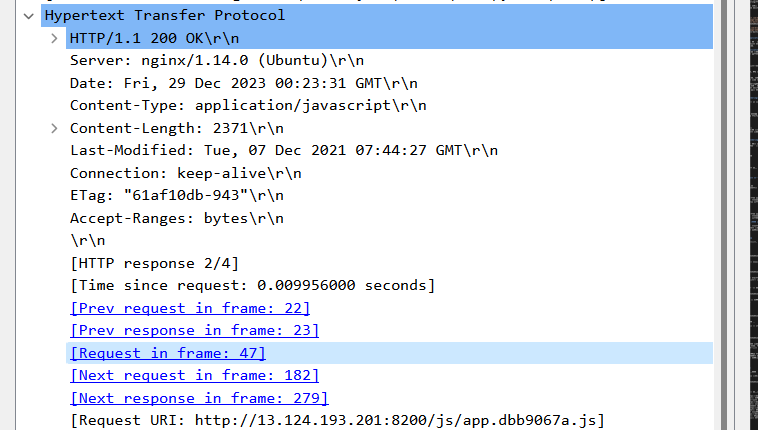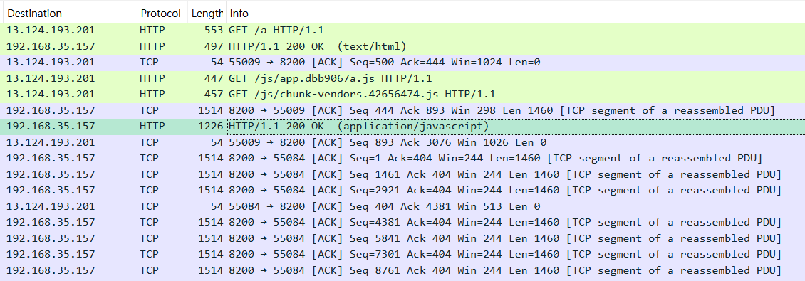 TCP 응답을 살펴보면 위의 사진과 같이 javascript 함수가 전송된 것을 확인할 수 있다. 이렇게 전송된 javascript 함수를 통해서 클라이언트는 동적으로 페이지를 생성한 뒤 뷰를 볼 수 있게 된다.