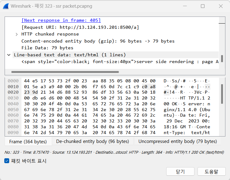 사진에서 응답의 body로 html이 그대로 전달된 것을 볼 수 있다. 즉 SSR 방식으로 이미 렌더링 된 파일이 클라이언트로 전달되었다.